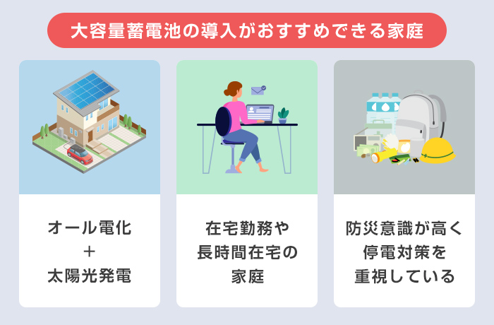 家庭用に大容量蓄電池を導入する場合は、「電気代の節約」と「売電による収入」、そして「停電時の安心」という3つの費用対効果の検証が必要です。